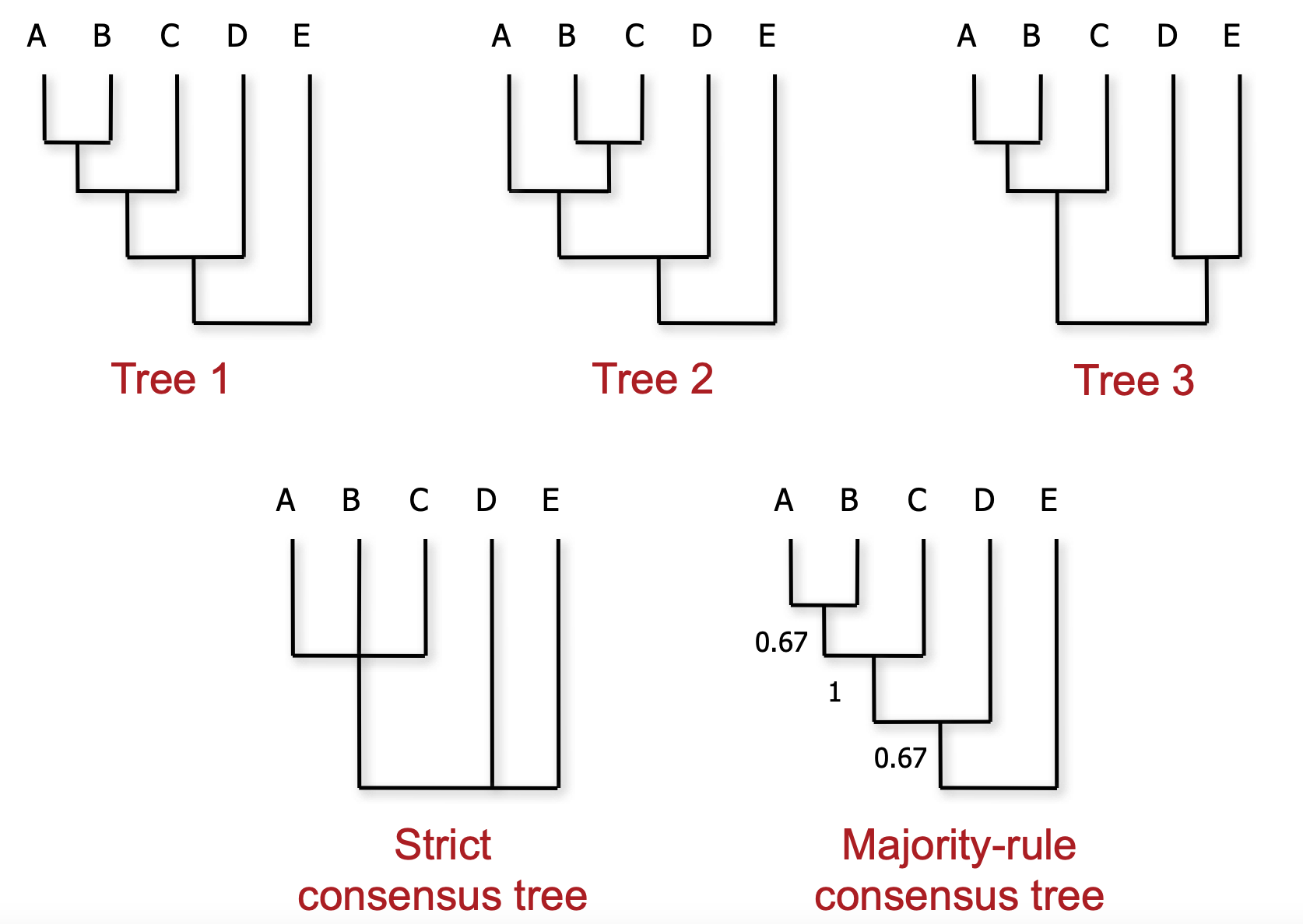 There are many ways of generating a consensus tree from a sample, with each having its own pros and cons.
