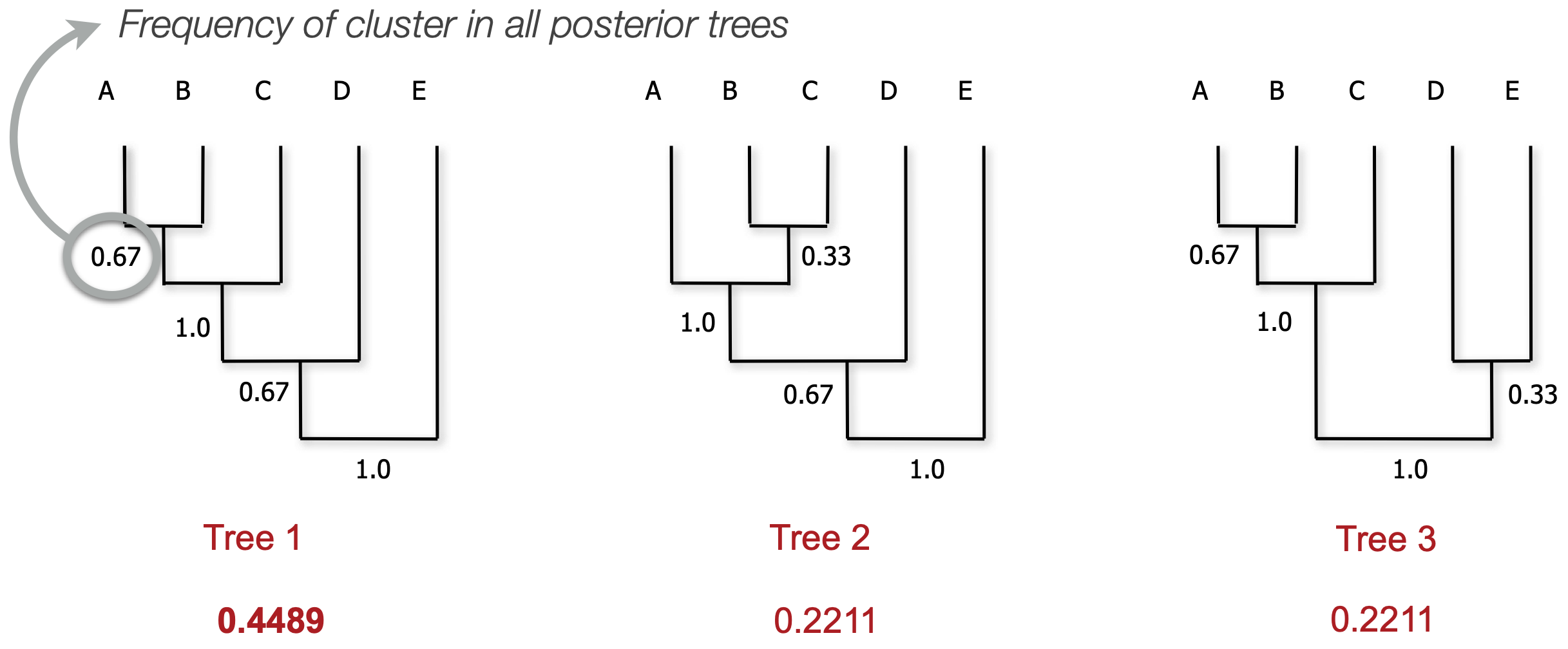 We've discussed how to summarize continuous parameters, however we also want a way to summarize a posterior distribusion of many discrete trees.