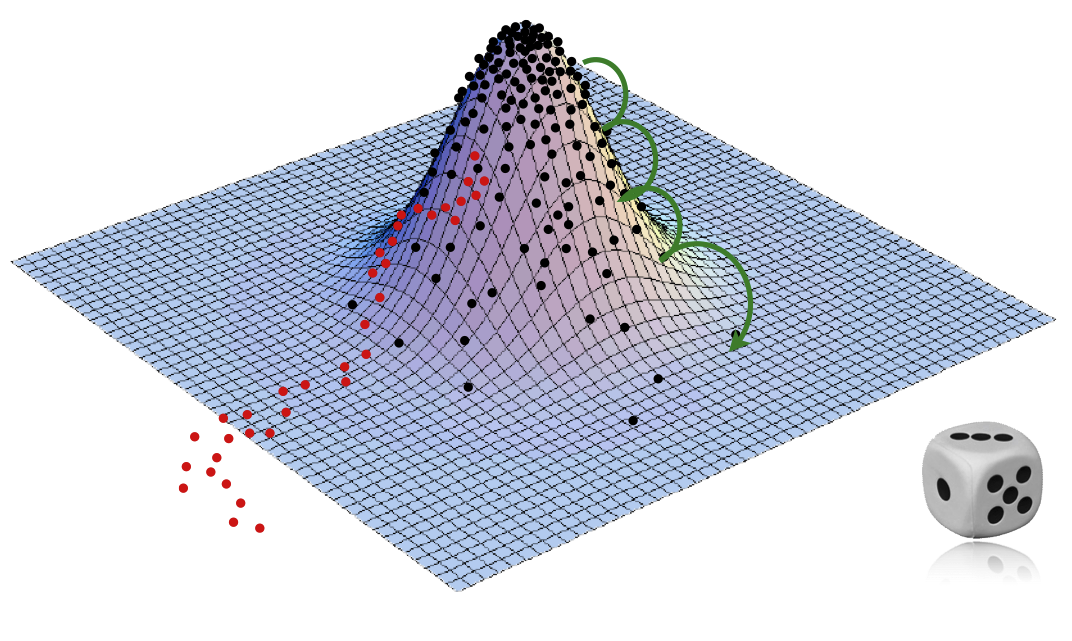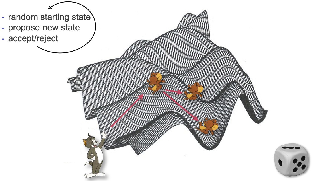 Use randomness cleverly to allow steps "downhill", in such a way that we end up with samples that cover the distribution proportional to its height