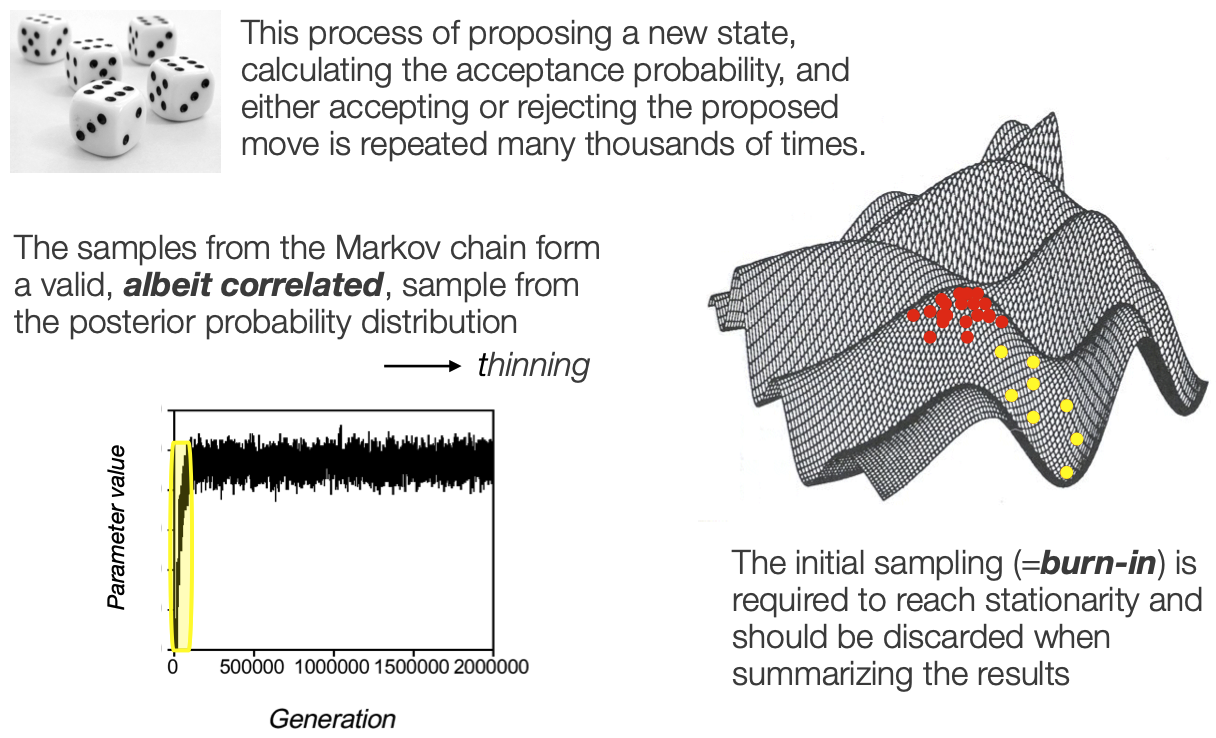 Posterior probabilities are difficult to calculate analytically. However, we can sample values from the posterior distribution with a frequency proportional to thir posterior probability by using MCMC.