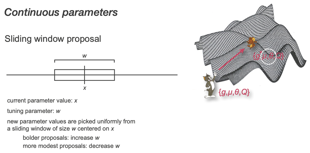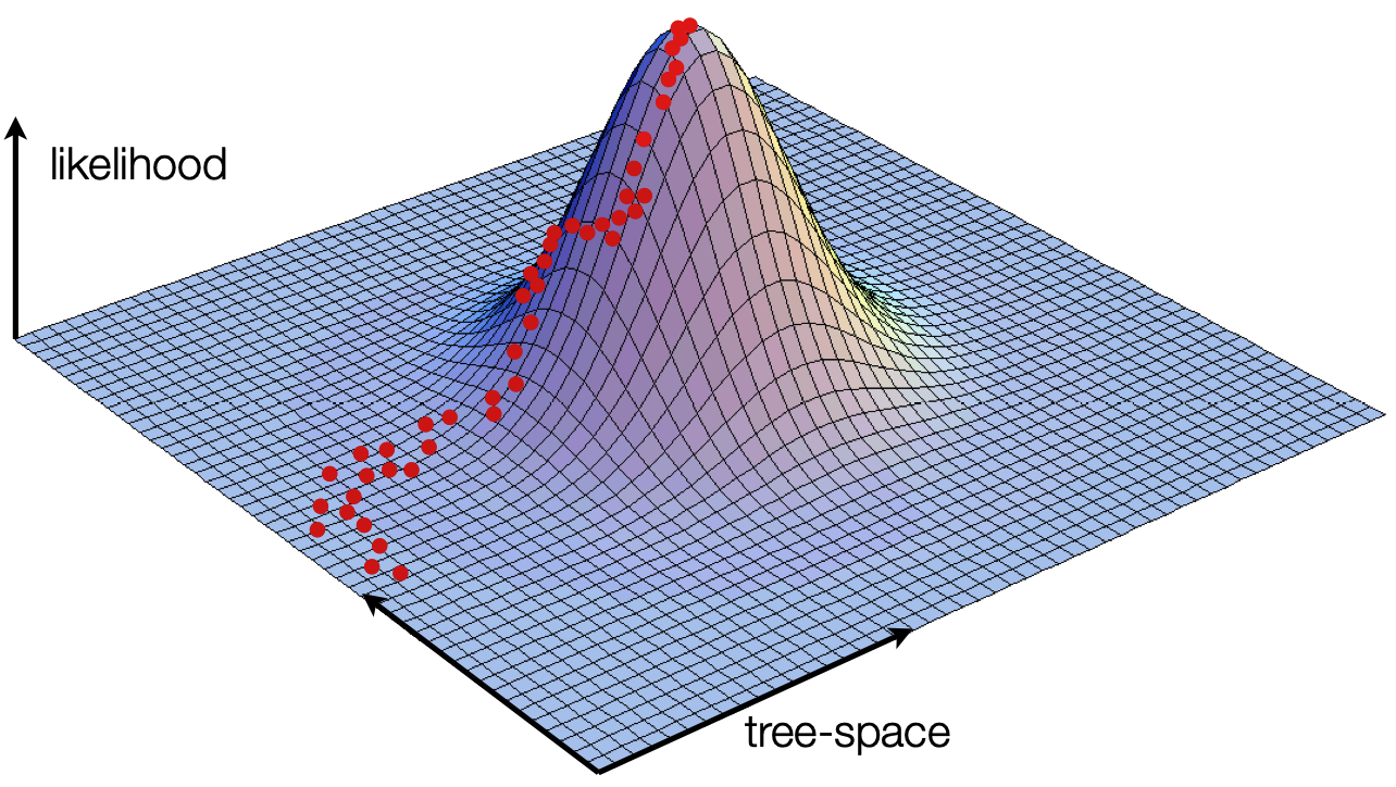 ML uses a "hill climbing" algorithm to find the maximum likelihood, and only ever steps uphill. Downside: we don't know the shape of the distribution, and we may get caught in a local optimum