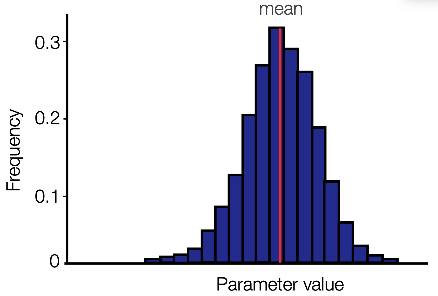 When we do this, we get a posterior probability distribution for the parameter. The mean will often be close to the MLE estimate, but we also get a full distribution